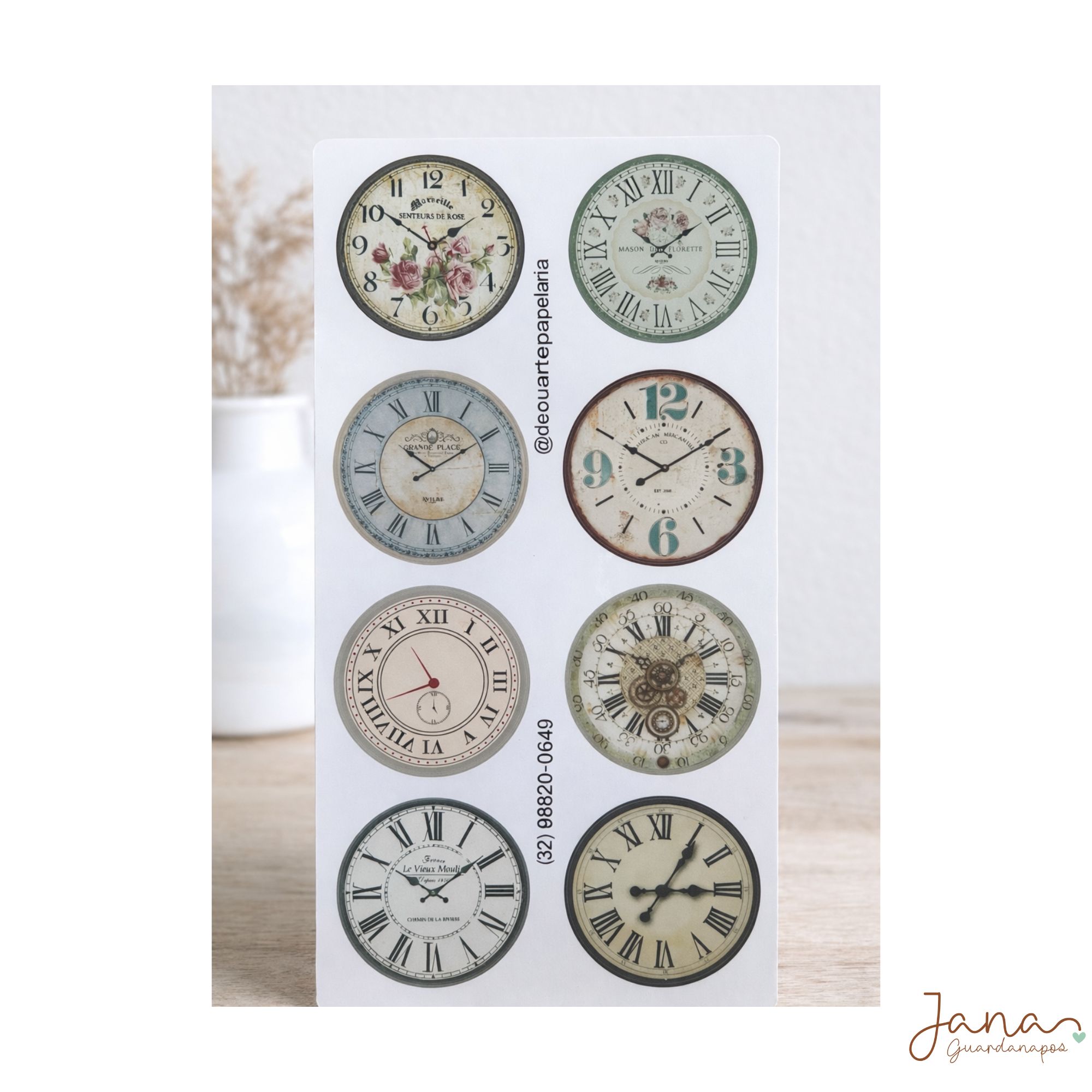 Cartela de papel adesivo contendo 8 relógios como ilustra a foto.